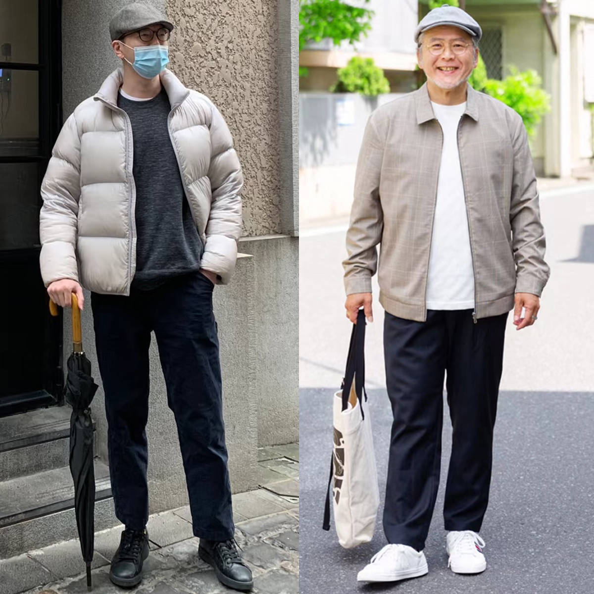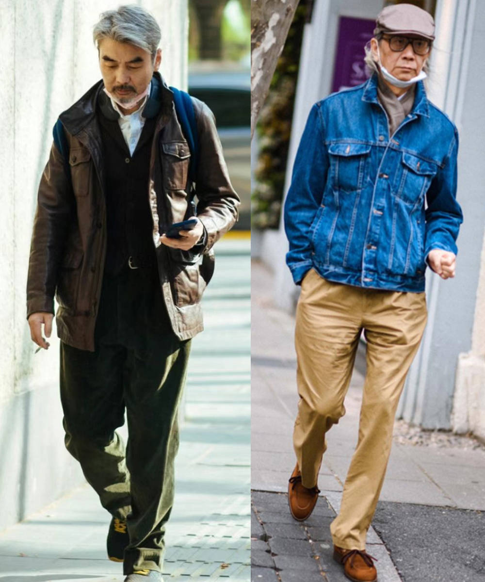 “夹克+休闲裤”的搭配方式,将中老年男性的干练利落气质展现得淋漓尽致,完全不显臃肿拖沓,体态挺拔更显得精气神十足。夹克可以选择皮夹克或牛仔裤外套,休闲裤以卡其裤、灯芯绒裤子为主,无论搭配休闲鞋还是复古皮鞋都非常时髦,佩戴帽子更是凸显了型男范儿。